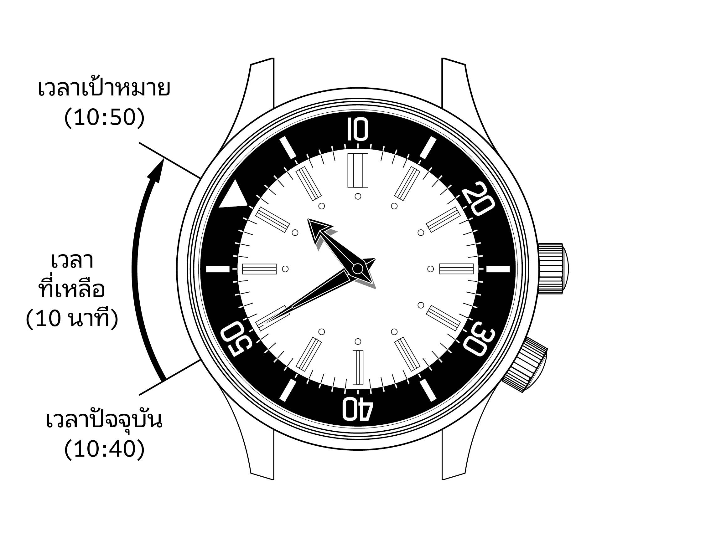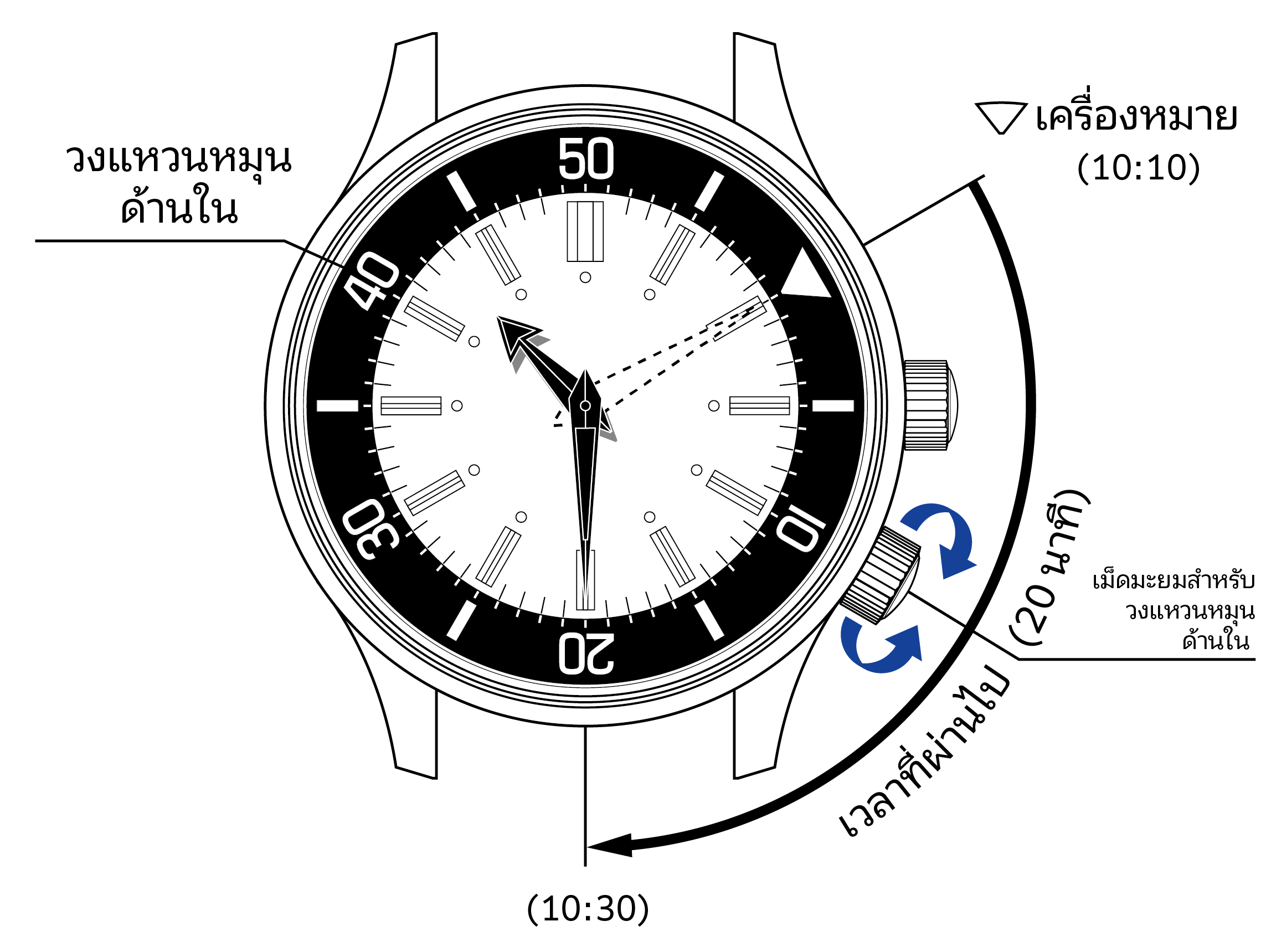 จัดตำแหน่งเครื่องหมาย ▽ ให้ตรงกับเข็มนาที เมื่อเวลาผ่านไประยะหนึ่ง คุณสามารถอ่านเวลาที่ผ่านไปได้จากตัวเลขที่เข็มนาทีชี้บนวงแหวนหมุนด้านในในกรณีที่แสดงในแผนภาพ เครื่องหมาย ▽ อยู่ที่ 10:10 แสดงว่าเวลาผ่านไป 10 นาทีนับตั้งแต่จุดนั้น