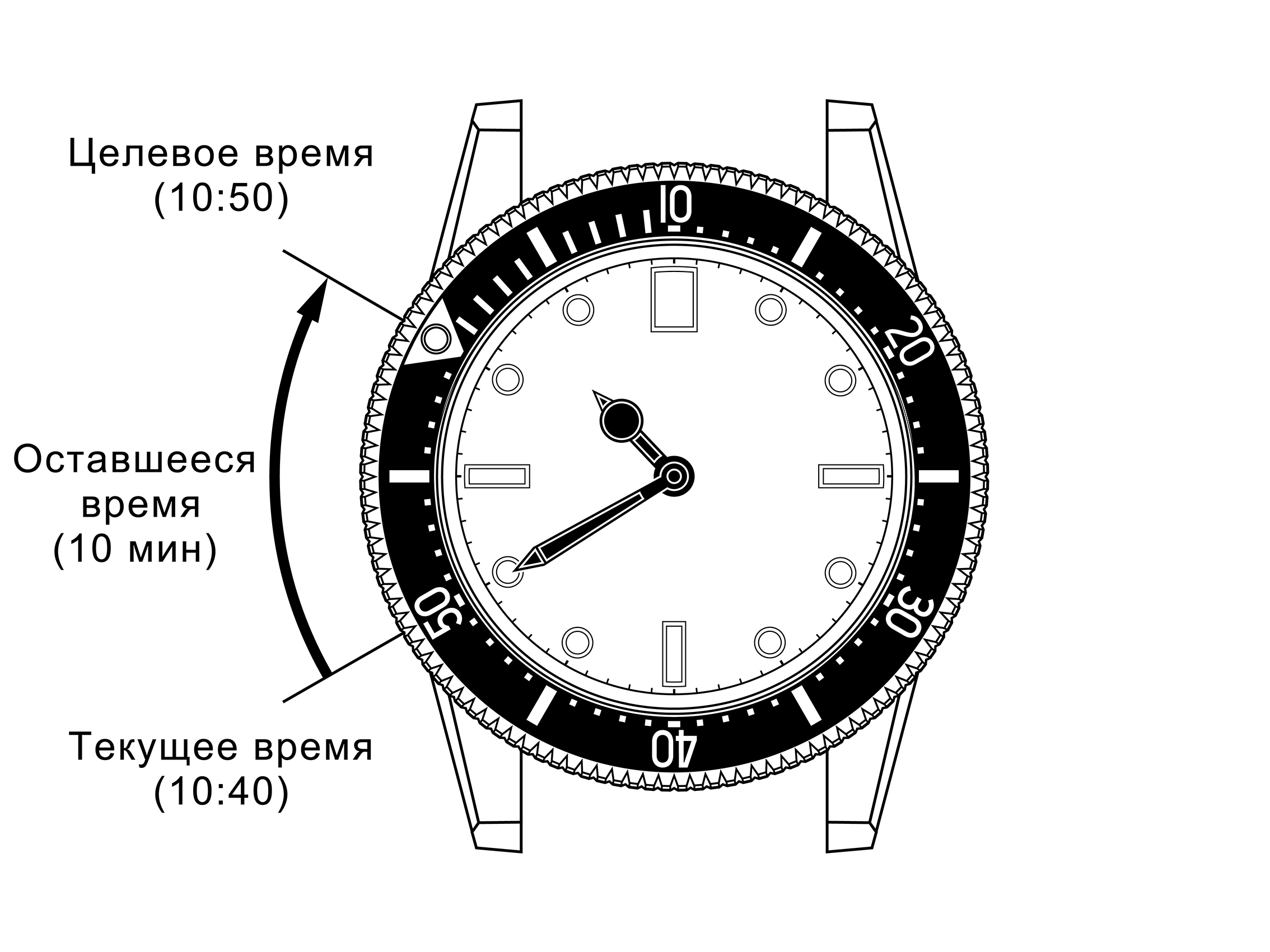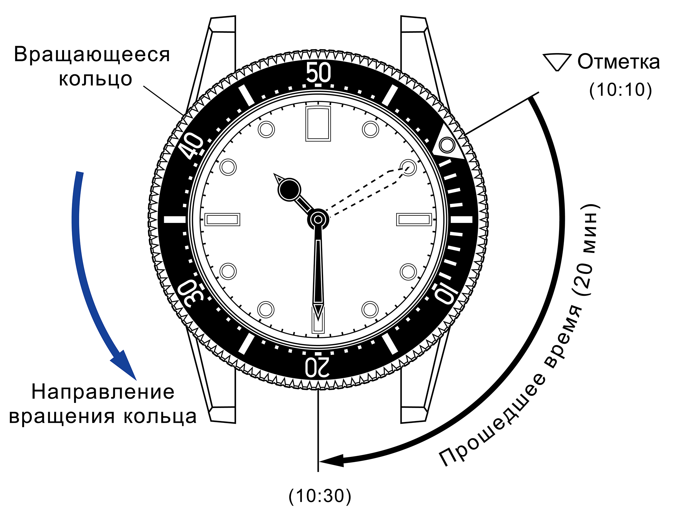 Совместите метку ▽ с минутной стрелкой. По истечении определенного времени прошедшее время можно определить по числу, на которое показывает минутная стрелка на вращающемся кольце.В случае, показанном на рисунке, метка ▽ установлена на 10:10, и с этого момента прошло 20 минут.