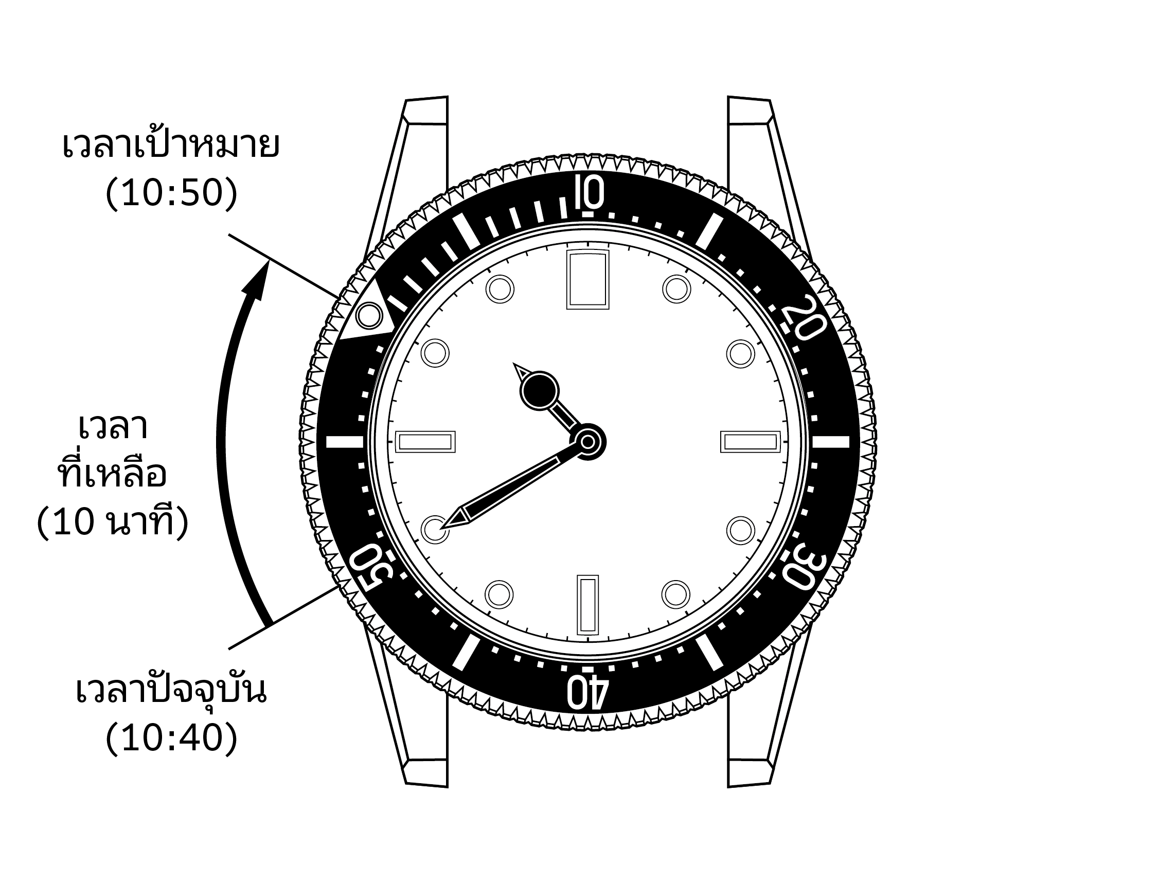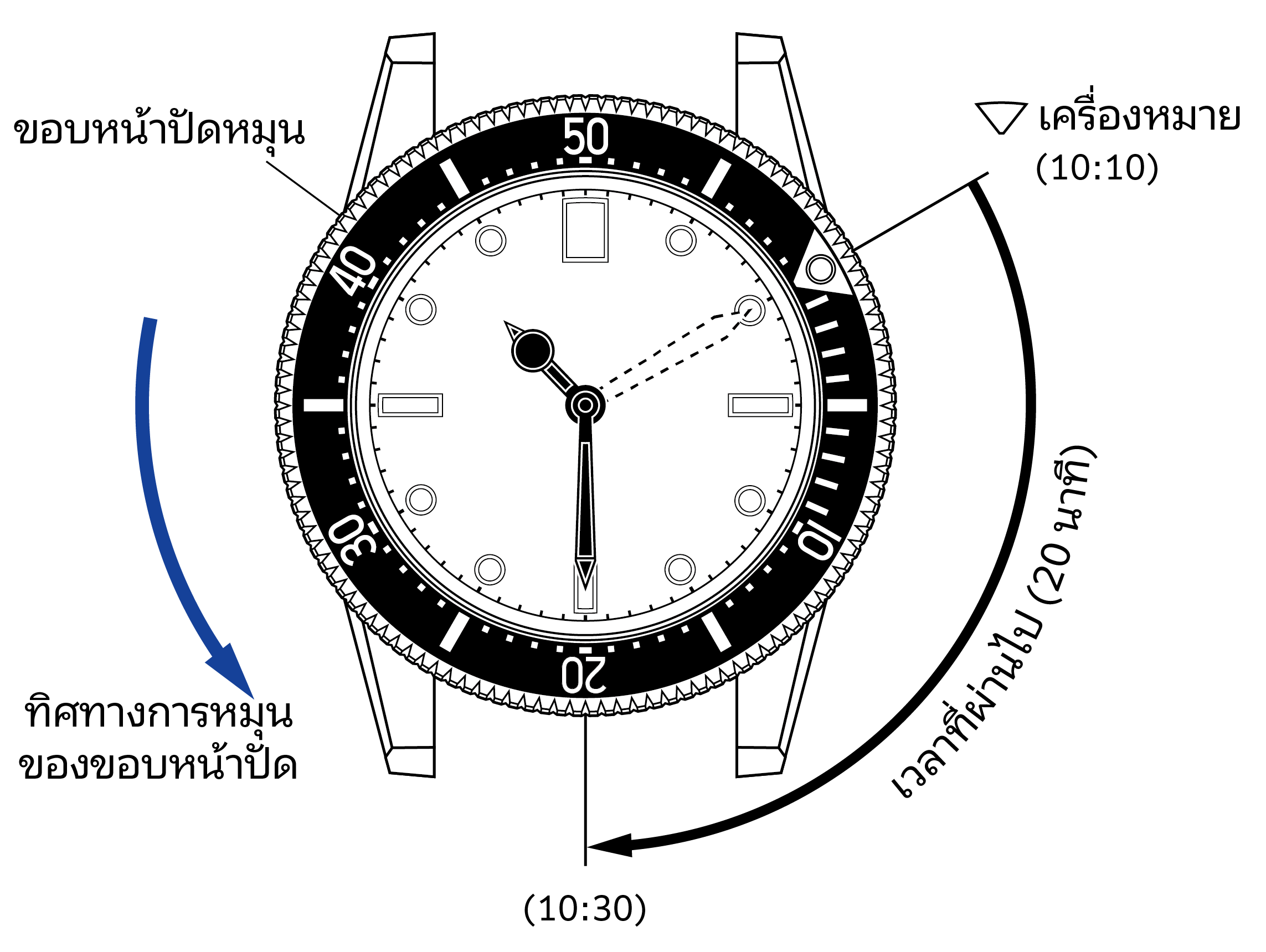 จัดตำแหน่งเครื่องหมาย ▽ ให้ตรงกับเข็มนาที เมื่อเวลาผ่านไประยะหนึ่ง คุณสามารถอ่านเวลาที่ผ่านไปได้จากตัวเลขที่เข็มนาทีชี้บนขอบหน้าปัดหมุนในกรณีที่แสดงในแผนภาพ เครื่องหมาย ▽ อยู่ที่ 10:10 แสดงว่าเวลาผ่านไป 20 นาทีนับตั้งแต่จุดนั้น